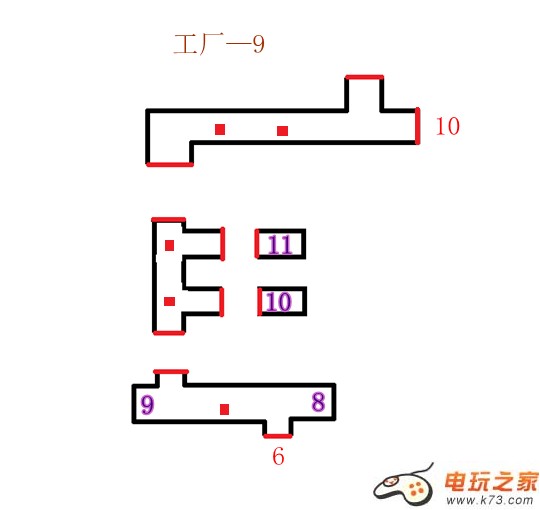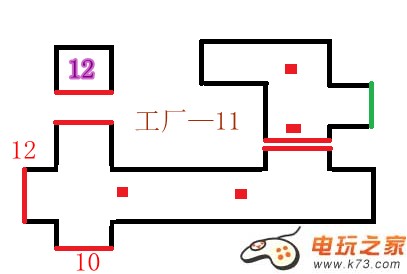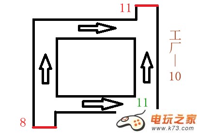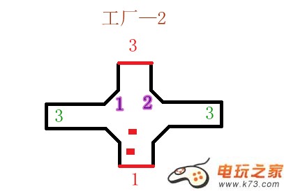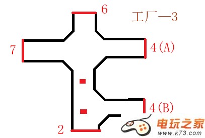 众人在荒野中发现了一座工厂,于是决定前去一探究竟。(工厂新增了两种敌人。守卫兽的防御力很高,而且会使用的光线扫射来攻击我方全体。另一种则相对好应付一些。门上边有红灯的门需要摁下开关后才能通过,开关我会在自制地图中用绿色的数字标记。自制地图中有箭头的地方表示单向行驶。)到达了工厂中心之后,众人发现了两头通路,于是决定分头探索!