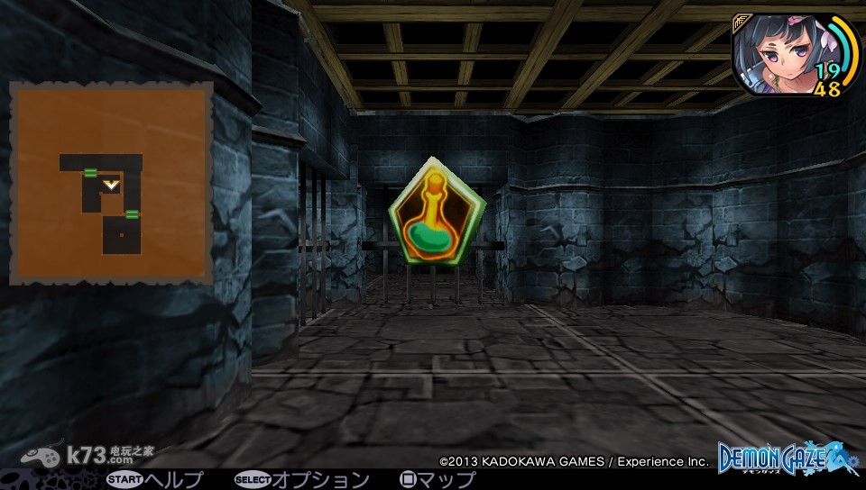 之后玩家可以在迷宫里摸索一下,熟悉一下行动的操作。在有瓶子标记的地方可以得到道具,有箭头的地方上楼,迷宫里会有不少这种提示性的标志,之后有机会笔者会整理一下做个表格放到一楼去。