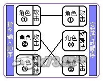 几乎所有指令都有着这个时间差,但是特殊技除外。执行特殊技指令后,角色会立即开始行动,不存在时间差。这样,有时就会发生后发先至的情况。例如:角色1执行魔法,动作开始,角色1执行普通攻击,角色3执行特殊技。当角色1的动作执行完毕后,角色3的特殊技却在角色2的普通攻击之前执行了起来。使输入指令的顺序123,变成了执行动作时的132。 |