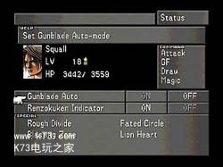 如果在特殊技画面(左上图)中把Renzokuken Indicator(连续斩技量表)设为OFF或者把Gunblade Auto(枪刃自动处理)设为ON的话,那么连续斩技量表将不会显示出来(右上图)。如果只是把Renzokuken Indicator(连续斩技量表)设为OFF的话,那么如果想增加攻击力就必须仔细注意Squall的动作,适时的触发追加输入。不过也这样也有个好处,就是可以在使用连续斩的同时给其他队员下达指令。