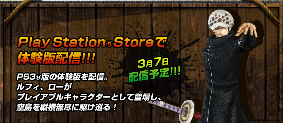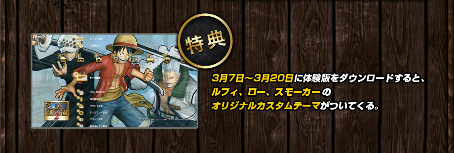 PS3和PSV平台游戏《海贼无双2》官方网站公布,将于3月7日开放可操作罗与鲁夫的体验版下载,且于这段期间下载体验版的玩家,将可获得原创的背景主题。
