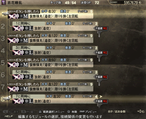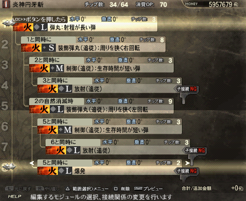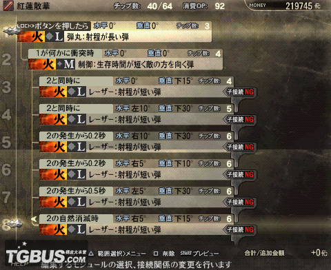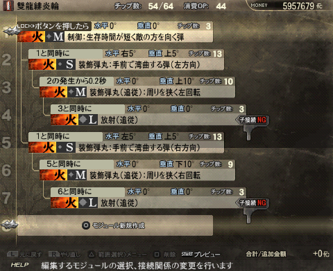 | 奥義·冥王破閃光·序(我是用神属性的就用了这名字= =) 消耗OP:21 1.弾丸:短射程弾 (S) └2.装饰弹丸(追踪): 周围狭隘右方回转 (M) 与1同时 右30° 下45° (好看用) └3.装饰弹丸(追踪): 周围狭隘左方回转(M) 与1同时 左30° 上45° (好看用) └4.制御: 生存时间短向下弹(M) 1和敌人冲突时 (增加伤害和瞄准方向) └5.レーザー:射程が短い弾(S)4自然消灭时 右10° 下45° (由于没有贯通弹,调整激光角度是为了打通一些中体型荒神的下半部分) └6.レーザー:射程が短い弾(S)4发生后0.2秒 左10° 下45° (由于没有贯通弹,调整激光角度是为了打通一些中体型荒神的下半部分) └7. 爆发 (S)4自然消灭 (追加一击伤害!) 强化版: 聖獣殺界配方: 蒼穹鳳凰陣(我是炎属性的) 消费OP 29 └1.弾丸:短射程弾 (S) └2.装饰レーザー(追踪):周围广幅左回转 (S) 1和敌人冲突时 上15° └3.制御:生存时间短向敌方弹(M) 与2同时 下120° └4.レーザー:射程が短い弾(S) 与3同时 下60° └5.制御:生存时间短向敌方弹(M) 2发生后0.2秒 下120° └6.レーザー:射程が短い弾(S) 与5同时 下60° └7.制御:生存时间短向敌方弹(M) 2发生后0.5秒 下120° └8.レーザー:射程が短い弾(S) 与7同时 下60° 强化版: 蒼穹鳳凰陣·轟 消耗:78 1.弾丸:长射程弾 (L)(或者换成横方向追踪弹) └2.装饰レーザー(追踪):周围广幅左回转 (S) 1和敌人冲突时 上5° └3.制御:生存时间短向敌方弹(M) 下120° └4.放射(追踪)(L) 与3同时 下60° └5.制御:生存时间短向敌方弹(M) 2发生后0.2秒 下120° └6.放射(追踪)(L)(S) 与5同时 下60° └7.制御:生存时间短向敌方弹(M) 2发生后0.5秒 下120° └8.放射(追踪)(L)(S) 与7同时 下60° 发现放射追踪有自动调整方向的功用,这下的话就解决了省去了延迟发射角度偏差的问题了,主激光阵也不用偏离角度,对大型荒神的话说不定还有连续攻击的作用, 烈冥王 配方: 破碎威力相当大,对雷神,猴子,炮鱼有奇效,我试了一下,基本上是正面一炮下去雷神就退一步,威力恐怖,消耗OP也大,范围也可观,可试着把配合一些减轻OP消耗的效果的插件和武器,问题是不能把枪口抬得太高,不然的话2个爆炸容易空,所以对鸟人还有触手怪这种弱点在头部的荒神的话这种就不好使了,不过,在对多个荒神的时候比如4猴子的时候,可以达到一弹下去轰炸多个的效果。 召唤弹(?)—炎神円牙斬 演示图:发射时,召唤炎神,抽出火焰剑 ,命中目标后连续2次大范围斩击,放出的小火球也是有攻击力的。 配方: 消费OP70,不算大,范围相当大而且不像凤凰阵那样有地形限制要求,当然也是有缺点的,那就是不能和伙伴靠的太近,不然一炮放出去的话伙伴NPC必定被吹飞……当然若是和多个荒神在一起的话可以一炮打多个 百花缭乱配方: 使用方法不是远程,而是近距离,比如剑在连击的时候R+X空中瞬间切换成枪后马上发射攻击会有最佳效果,平时万一被包围时用的话也有不错的效果,只是注意自己和NPC会被吹飞的可能性,由于是自身中心超大360度范围无需对准敌人,近身战有保身作用。 PS:测试这个选择了R2的某个要打3条狼一开始被3个铁处女杂兵包围的任务,当时啥都不打先把3条狼引到3个铁处女的中间来,自己在中间先一个闪光定身然后直接一颗百花缭乱弹直接秒杀3条满血的狼+3个满血的铁处女杂兵…… 雙龍緋炎輪配方 消耗OP44,示例图上由于目标把子较小,2颗只打到了1颗,对付实际大型荒神的话2颗都能打到的。还有就是这是远距离专用弹,不能太靠近荒神,不然的话一颗都打不到的,优点是竖直范围的破碎,专门用来打蝎子神马的,试验过能轻易破雷蝎子的针(当然你的枪要好{:4_720:}←一番いい銃を頼む),需要在远方瞄准,但不用瞄得很准,只要保持不要撇开45度就行了。因为制御弹是瞄准敌方的。 |
