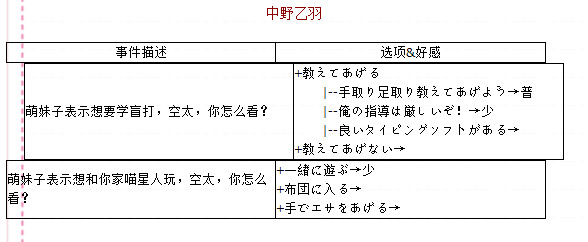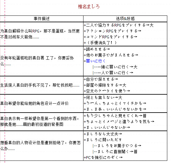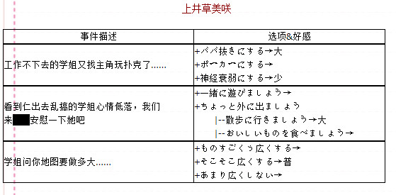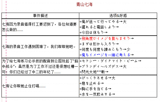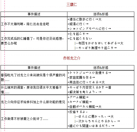 烦恼事件貌似是随机出现的,不过可以肯定的是只有在有工作的时候才会出现。烦恼事件这里也是按人物来分,不过由于不太好定位所以我只好用自己的话来描述事件了,大家到时候大概看看是哪个事件然后对着选项找吧……(注:红色选项表示会随时间消失,蓝色选项表示延迟出现。至于后边的“大”“普”“少”应该都看得懂吧……就是提升好感的多少)。