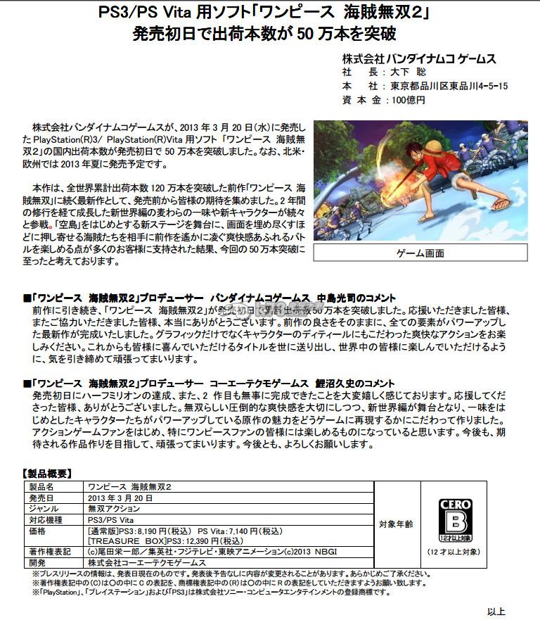 来自NBGI官方今天官网的更新,其于昨天发售的《海贼无双2》自发售后首天表现强势,其销量直接突破了50万套!