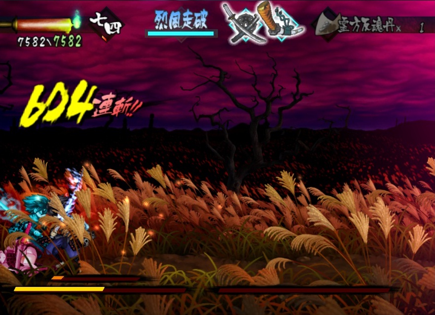 不知道是设计上的问题还是BUG,百姬只要断刀后再换刀的时候可以顺利中断,鬼助断刀后换刀就算被打还是照样能换,通常百姬都是最先死的,打鬼助时要注意他落地时的状态,如果他落地时的无敌状态刚好是你连续攻击后的硬直时间他就会逃出角落,然后赏你一招很像百鬼乱闪的招式(百鬼乱闪‧弐???)。因為等级低而且没装仁王の腕轮,最后打了1小时左右才结束,从58升到74等。