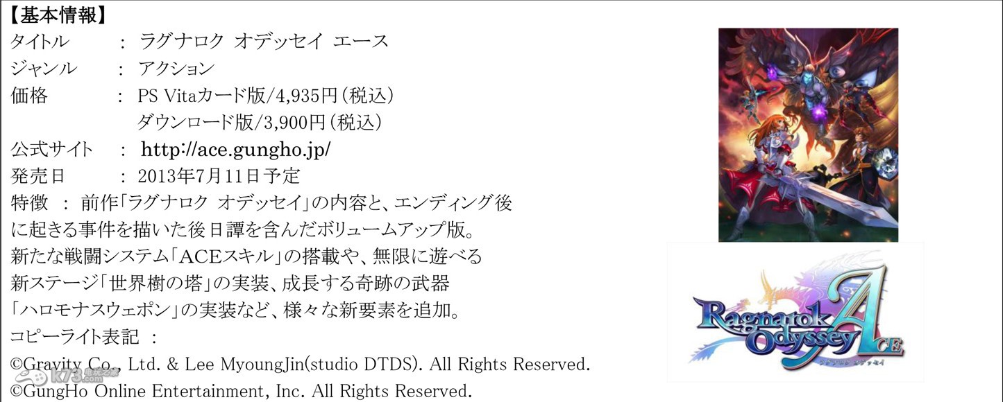 本次的《仙境传说奥德赛ACE》将会分实体版和数字下载版双版本进行发售。实体版售价4935日元,数字下载为3900日元,游戏的日版发售日期定为2013年7月11日。