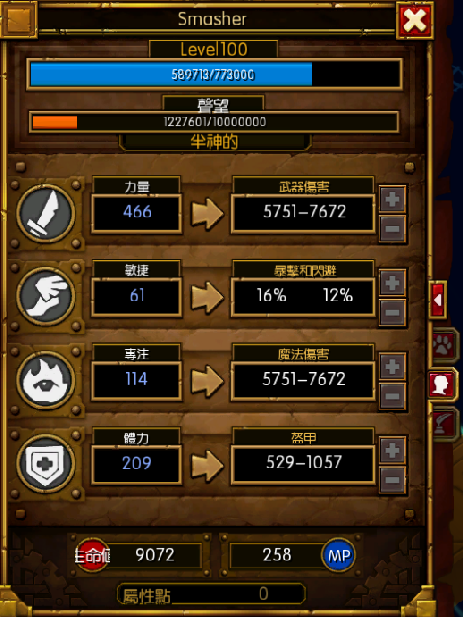 目前是休闲NG++,不过机体目前小心点可以勉强打Elite的BOSS。点数算是偏力体,不穿装备力敏专体334 , 5, 32 , 164,穿上后为下图
