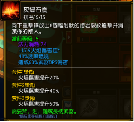 以上机体报告完毕。以下是杂感。 输出完全是靠技能,不靠普攻,又有震波可以造成92%晕眩,所以不用举重这个天赋增加,攻速和晕眩,超能也不点,因为有充能领域了。不用烈焰锤而用灰烬石震是因为目前火伤加成伤害高且不用耗能,但是非常容易缺魔。在近距离跟敌人对战时候,两者似乎没有太大差别,但是灰烬石震优点是追击较远,所以可以远距离打BOSS,你只要原地补盾喝魔水,放灰烬就打死所有远程BOSS了,而且烈焰锤的小缺点是要比较近距离放,才比较容易打到目标。若是碰到近战BOSS,灵活度也比烈焰锤高,你不需要近距离接触BOSS放烈焰锤,突击跳走或是暴风逃走就可以直接放灰烬石震,还有时间补能量补盾喝药水。不过灰烬石震有个缺点是会被地形挡住,高低差或是障碍物都会阻碍灰烬石震,烈焰锤则没有这项困扰。不过偶尔还是会发现,虽然有地形阻隔或是高低差,你和敌人距离够近,对方还是照吃伤害,还全吃呢。
