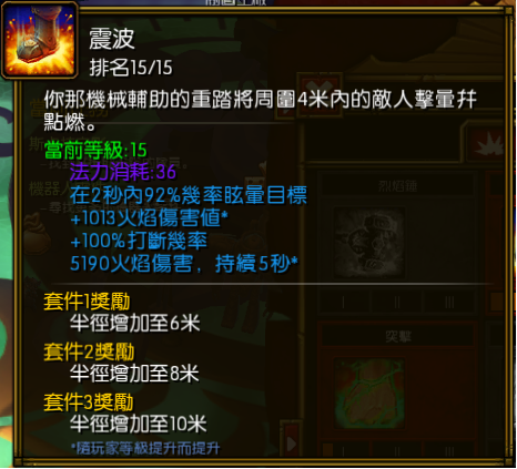 震波非常好用,尤其在火伤加成效果、范围够大且魔力消耗不多的情况下,是清小兵的神技,突击冲进去怪堆,放震波和充能领域,小怪在老兵以下大多数都死光了,而且对于有盾的小兵,也容易被DOT烧死,不太需要破盾就可以清场,外加打断100%和晕眩92%,好技能不用吗?而且这时能量也容易就满了,你可以补盾,然后继续找下一波小兵,碰到血多的怪就放1-2道灰烬石震或是多补1-2到震波。甚至是不用烈焰锤或是灰烬石震等大招,满场一直跳来震去,突击+震波+充能+盾不停循环,BOSS照样给你磨到死,顶多就是喝瓶魔水。另外的想法就是配合招换物+宠物,突击+震波+充能+盾,伤害输出靠宠物和召唤物也可以。