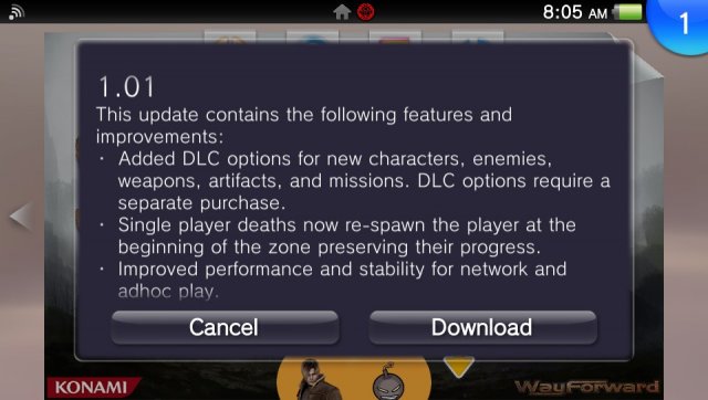 玩家会发现在打开寂静岭:记忆之书时会弹出来这样一个升级框。这个1.01升级为339MB大小,并提到了几处修复和改进。列出的改进之一便是单 人模式的死亡系统。无疑很多人都会对此表示欢迎。毕竟记忆之书不是个很简单的游戏。希望能搞到修复和改进的详细列表,这样我们就知道有啥盼头了。DLC选项也随着这次升级发布。这个DLC大概会添加11种新武器、2个房间,14个宝物,15份笔记和6种新敌人。目前还没有DLC发售的准 确时间。但是看看Playstation商店的更新情况,可能今晚什么时候便能看到该DLC。能看到一款寂静岭游戏受到Konami的待见真是要感激涕 零,即便这个补丁已经来的有点晚了…… 我还是很喜欢记忆之书这款游戏的,所以不论有什么新东西出来我都会很高兴。我会发信给Konami问一下到底什么时候能玩上新DLC。