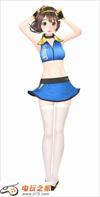 这个宣传泳装是由头饰、上衣和裙子组成的三件套。Sofmap版采用了清爽的蓝色挤掉,右胸部位有“Sofmap”的图标。泳衣边角采用了黑色和黄色增加了时尚感,清纯的白色长筒袜也是特征之一。