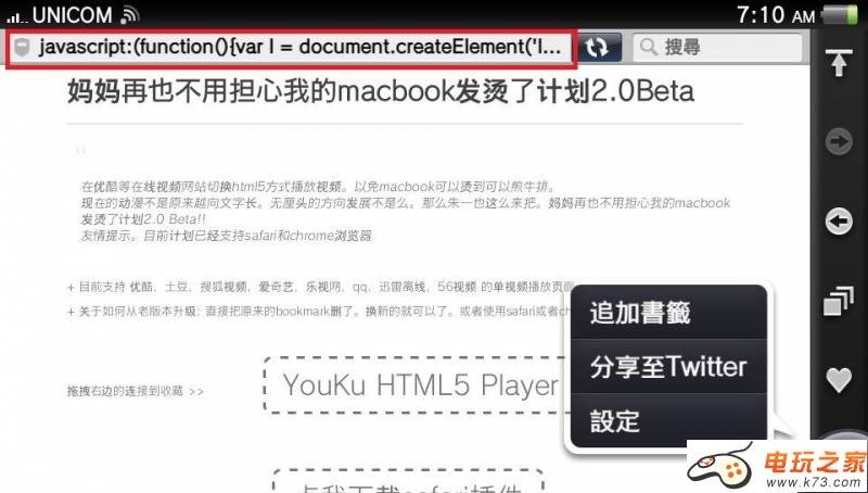 1.首先用VITA浏览器登录这个网页地http://zythum.sinaapp.com/youkuhtml5playerbookmark/