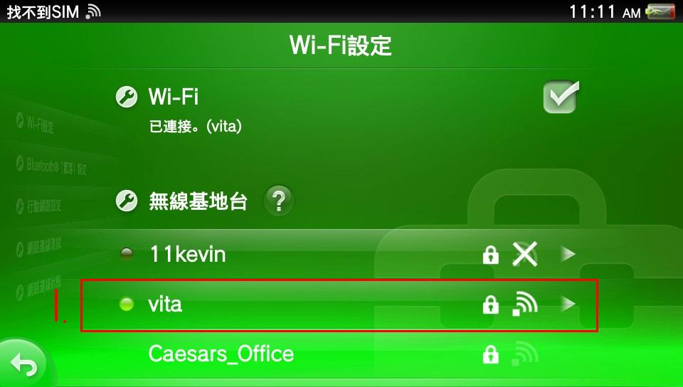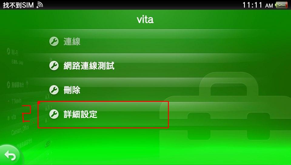 设定>网路>WI-FI设定>连接自己的WIFI热点.图示VITA是个人自设名称>详细设定