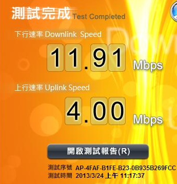 终于测试出低价位AP网速12/4也能high起来 连线测试很稳定.几乎是10~10.4M上传2~2.5M的速度另外用朋友600多买的AP测试也都有10M测速虽是参考值~但多少都有影响~~跟玩家连线.最重要还是要看对方连线速度跟伺服器.稳定值