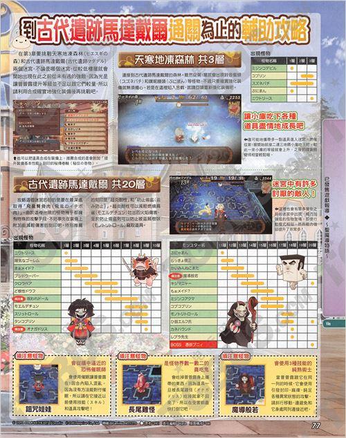 通往古代遗迹的森林一共有三层,这是用来提升初期级别和装备,并且收集简单物品的固定迷宫部分。而古代遗迹则有20层,属于随机迷宫,其中需要注意的怪物有以下三种: