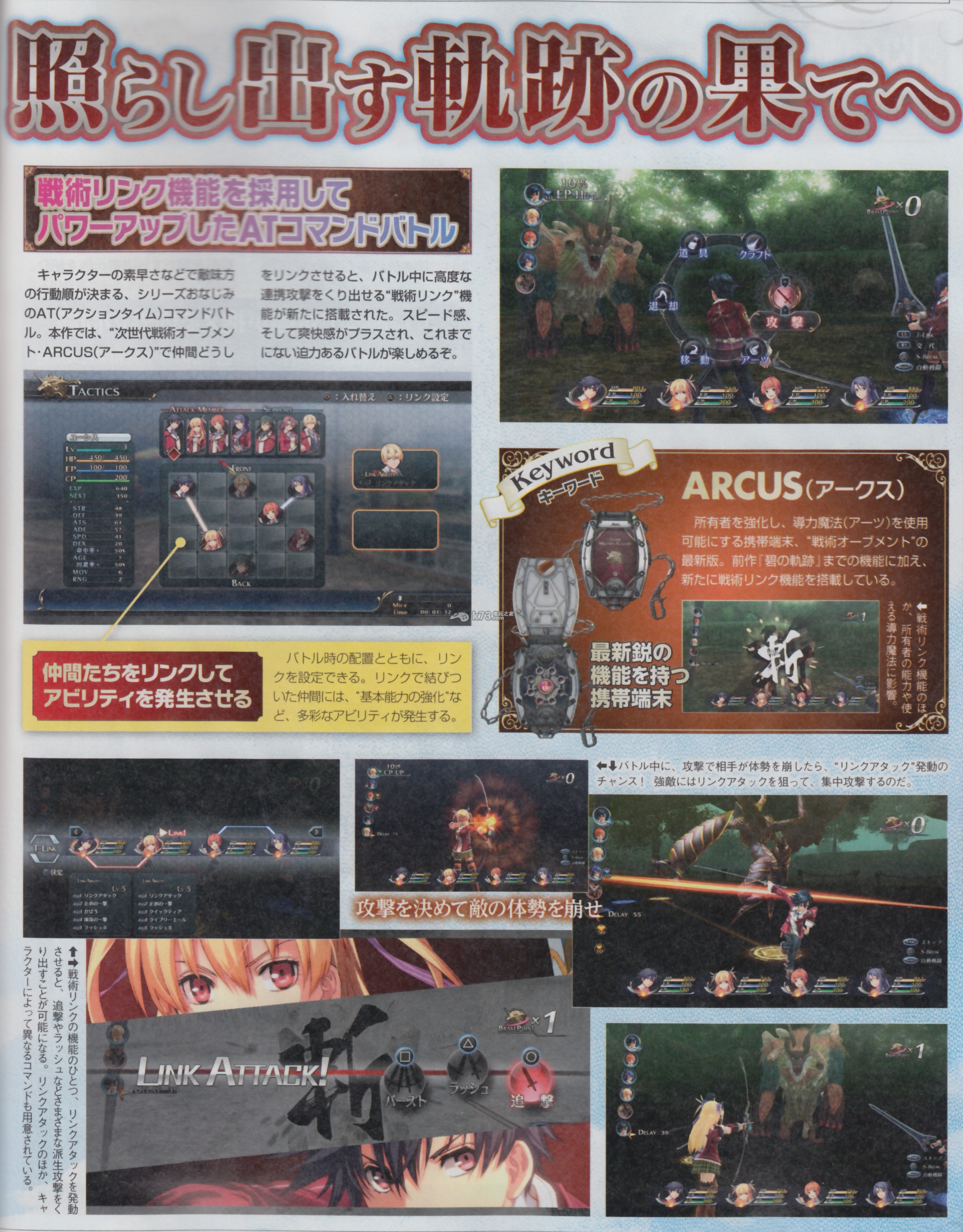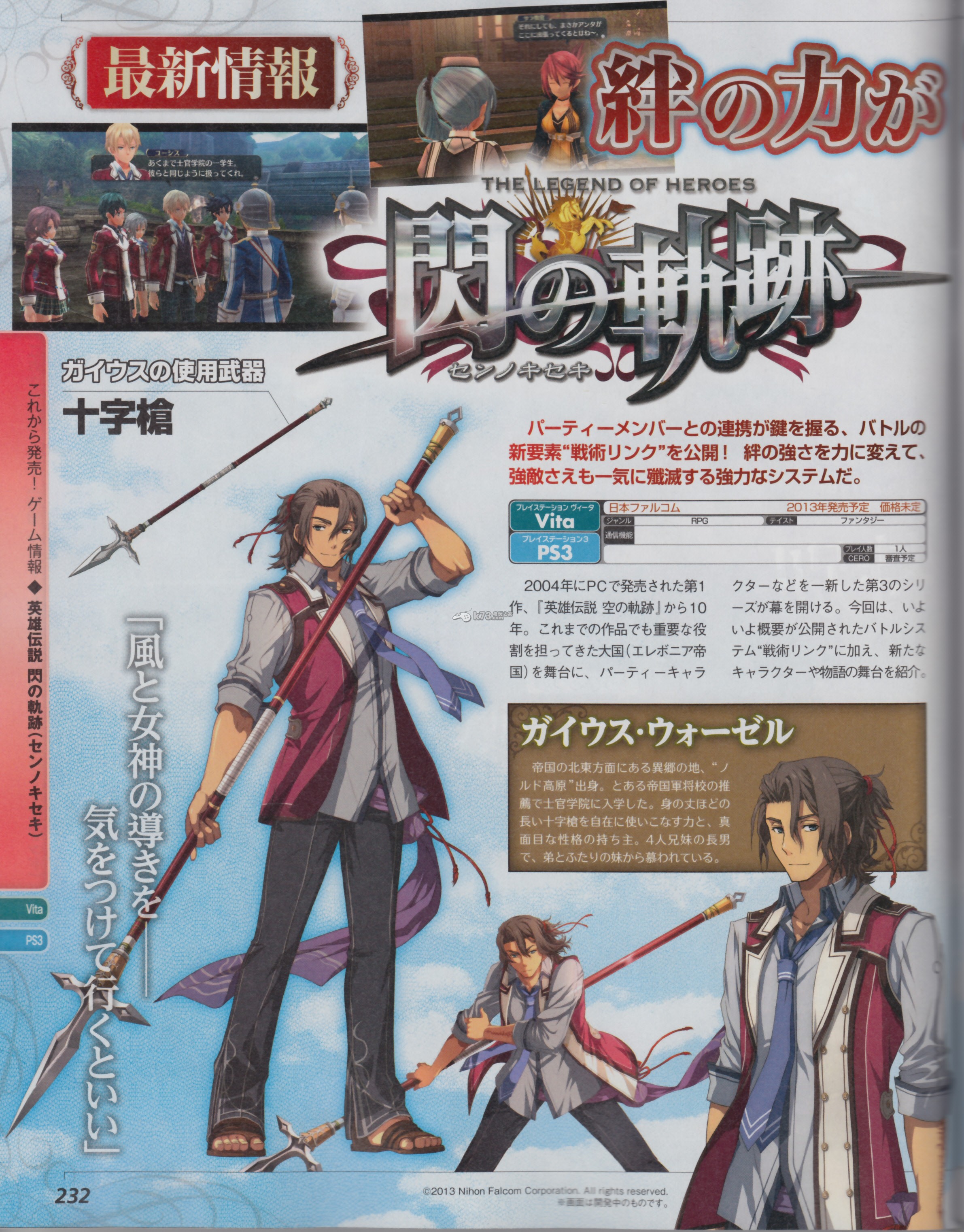 本周的fami通杂志图上公开了Falcom将于PSV和PS3双平台发售的角色扮演游戏《英雄传说闪之轨迹》的全新情报,本作关于全新的十字枪角色、游戏的战斗系统以及全新的故事舞台和冒险区域在杂志图中进行了介绍。