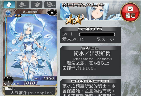 进化卡片其实是相当鸡肋的设计,玩家花了时间与金钱去进化出来的卡片,成长幅度却不比容易取得的实用四星卡高,其中只有一张用三万元合出来的第二型贝琳还算好看能用,不过成本很高,想逆合成冲满等还得多花几次三万来做卡片,不如把钱用来升级自己原本就有的四、五星卡片。如果玩家钱很够用又有收藏癖好的话,可以等卡片牌组有一定战力后,再花钱把较为少见的进化卡片合出来,看看有趣的支线剧情,了解这些卡片之间的关系,并填满