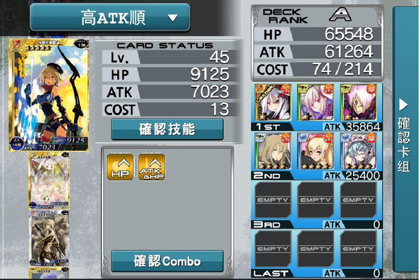 玩了一段时间的玩家手中拥有较多且满等的四、五星卡,BC 上限也越来越高,可以逐渐将三星卡片给替换掉,或只留一张填洞,由于卡片等级高,Combo 加成影响才大,就算只派一排也有相当不错的伤害输出,想要快速秒妖精才需要用到第二排,Combo 效果不错的芙瓦妮塔、提妮亚、糖妹三人组在此阶段还是可以继续沿用,罗宾汉弓箭手四人组与魔女三人组的效果加成也很强势,不过四人组搭配的COST 还满高的,且威廉和罗宾汉较难取得,魔女伊莱恩也得花时间去打因子收集,不过再怎么难搞也比两张六星卡的『百万富翁』容易的多,莫德雷得、君士坦丁都是相当难抽到的卡片。