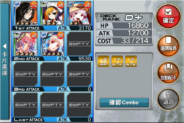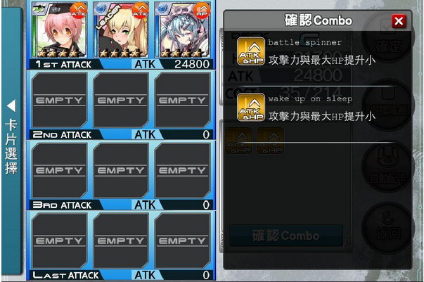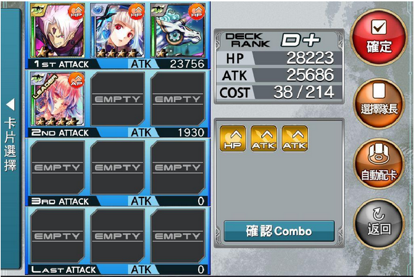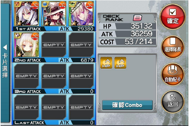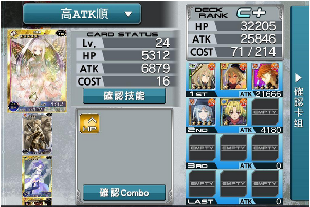 新手玩家的BC 上限不高,幸运抽到四、五星卡也还没练起来,若想搭配Combo 出牌的话,建议以COST 较低而等级较高的卡片来组合,因为单张卡片COST 超过13 对新手玩家的BC 负担太大,会减少战斗次数,而Combo 效果以提高ATK 且二张卡片就能组合出来的搭配最好,以下牌组最容易搭配出来的是『野性之组』、『真.蔷薇轮盘』,使用到的四张卡片都能探索秘境取得,缺点是卡片本身的攻击威力不强,就算发动Combo 的加成效果也不大,而『巨人守护』、『复仇者』、『心与天使』这三个Combo 由于有歌尔莉凡丝与金髪伊索德两张CP 值较高的卡片,所以伤害的表现会比较好。