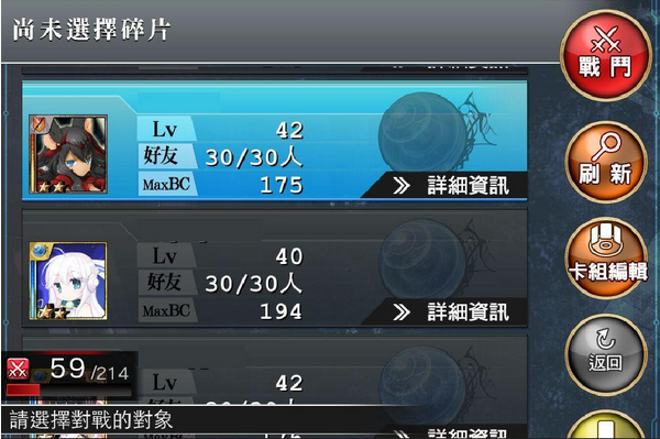 而用来攻击的卡片建议以高星数且等级高的卡片为主,至少要四星以上、五星更好,这样即使只派一张的攻击威力也比小狼女高许多,COST 也不会太高,只是拿到的经验值与BC 花费的比例较接近,想靠打因子战冲等的效益会比放小狼女低,想要再确保胜率的话就把第一排放满,毕竟大多数的玩家都是以打妖精为主,为了节省BC 总是会把牌组卡片放少一点,除非你是打到要休息才在调整牌组引人入陷阱的地雷玩家,否则三张高等级的卡片,再挑丽奈特、依缇尔、海琳、兰索尔等没练满且星数少的卡片去打,虽然BC 消耗多了点,不过获胜率是满不错的,可以确实收集因子,且对于等级高又都点BC 的玩家来说,一场COST40 左右其实满OK 的,能搭Combo 更好,别打五星又练满的卡片头像。