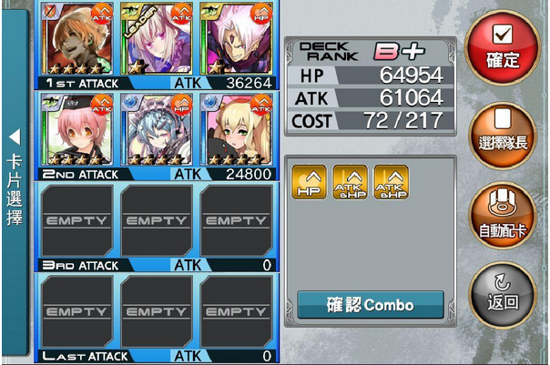 在牌组安排上,具有最初攻击的技能就得放在第一排,技能才能发动,而受到攻击回数影响的技能,就要尽量往后放,技能效果才会大,建议玩家每一排都要放一只具有补血技能的卡片,另外两张则放攻击高的卡片,同一排不建议放两张补血卡,如果牌组放到二排以上的玩家就要把Combo 加成计算进去,基本Combo 就是同阵营、同性别,并在特殊人际关系的组合Combo 下点工夫,你会发现Combo 组合的好,就能省下大量BC 来多打几只妖精;发动技能除了机率之外,放得越左边的卡片就能优先发动技能,面对等级较高的妖精时,可以把第二排以上的补血卡挪到第一个位置,而可以直接秒杀的妖精就把补血卡挪到第三个或中间位置。
