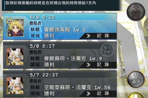 星期一是个可以疯狂打妖精的日子,探索秘境遇见妖精的机率与BC 回复发动率都大幅提升,善加利用BC 打妖精的方式就是打自己发现的一般妖精时,放一排共三张卡片就好,让妖精剩余三分之二左右的血量,放出去让朋友帮打拿卡片,等到残存血量不多时再自己打掉;打朋友的妖精时就放一张攻击力8000 以上、COST15 以下的卡片帮打,才不会在一只妖精上花太多BC 。此秘境的第五区会掉两张二星卡片,建议玩家有多余AP 就直冲五区,打到的卡片可以卖比较多钱。