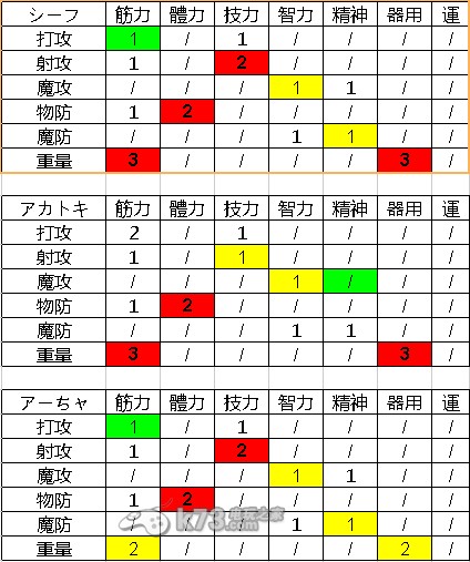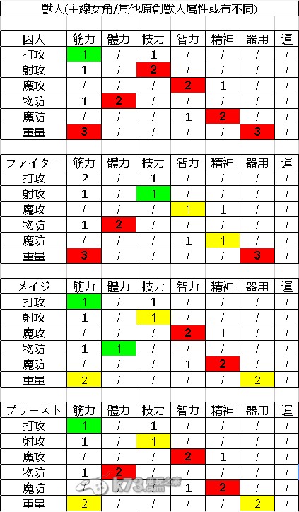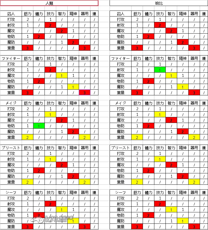 黄色=增加人物属性能提高该种族职业的能力中位值;