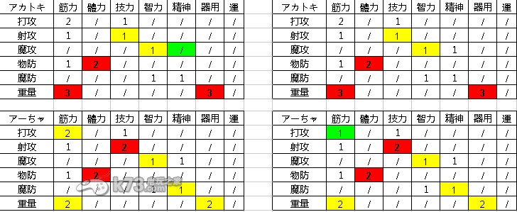 虽然目前只完成了3个种族的资料,不过大家可以留意到为什么NPC说明指囚人是最强的职业,因为囚人不论在任何增加的属性当中,都拥有最高的能力值。只是囚人的技能并不专业,需要玩家先提升职业等级以学习技能。而每一个种族也有两个属性偏低的职业属性,你可以从中留意到那个种族最不适合当某个职业,以人类为例,最不善长当メイジ跟アカトキ,因为他们拥有该职业的最低值。