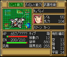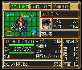 第38话。第5回合白河愁作为我方增援在下方出现。推荐打法,本话是练就LV99的大好机会,看到曹纲练到LV95,笔者的野心爆发了^ ^第1回合NEW走位如下图,其他人对付下方敌人。第2-3回合NEW待机,下放敌人可基本清光,第4-5回合NEW往右上角走,第6回合往左上角走,第7回合到达左上角,第8回合清光所有人。普露LV43驾驶百式一炮轰掉包括哈曼在内的19台,获得4W5经验,升到LV99!说一下哈曼,她的座驾装甲880,恐怖,用浮游炮打的时候气合比热血来的有用(以后都是如此)。8回合结束。