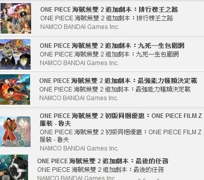 这里和玩家们分享的是游戏《海贼无双2》剩余的四套挑战剧情DLC下载,分别排行榜王之路、九死一生包围、最强能力、最后任务等,有兴趣还没试过的玩家可以下手玩玩了!