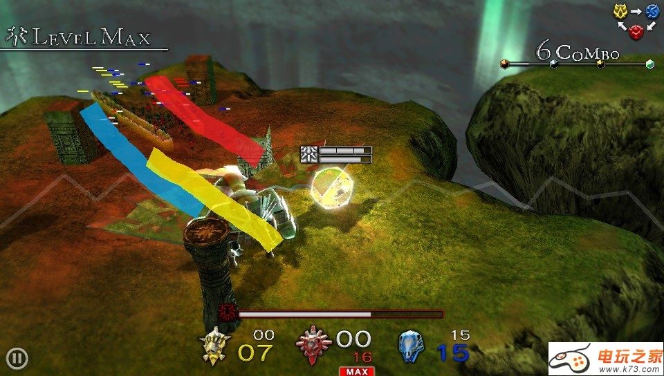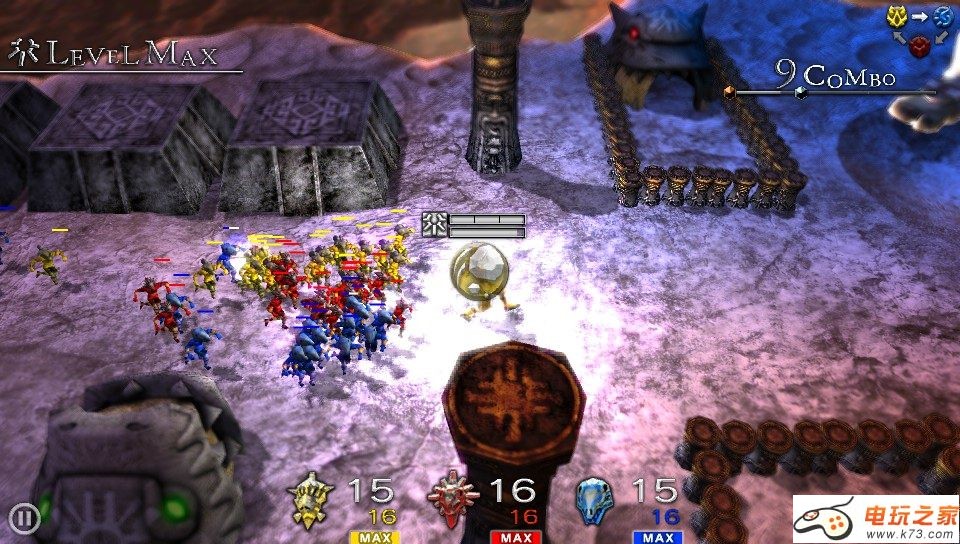 第六关 一个可以刷100bad奖杯的关卡(不过有第一关这个更好的选择),节奏非常的满,注意点击空隙比较大,过程中布置小兵最好2-4个一次布置,有毒气的地方要有小兵站在绿色开关上才行。BOSS战很简单,如下图位置时候开始布置全弓手,布置两个属性后就加攻击,然后再布置第三个属性兵种,最后补上一个防御或者重力状态。