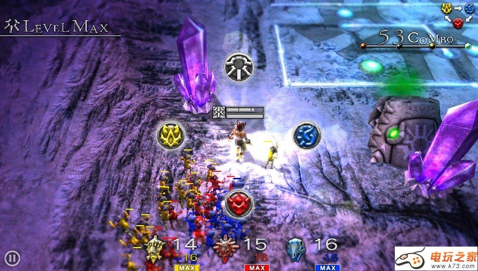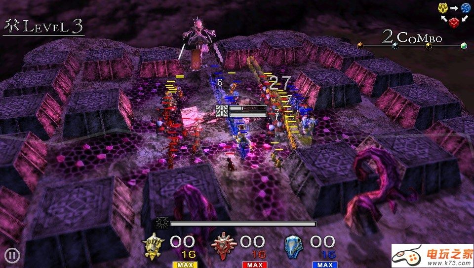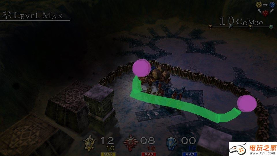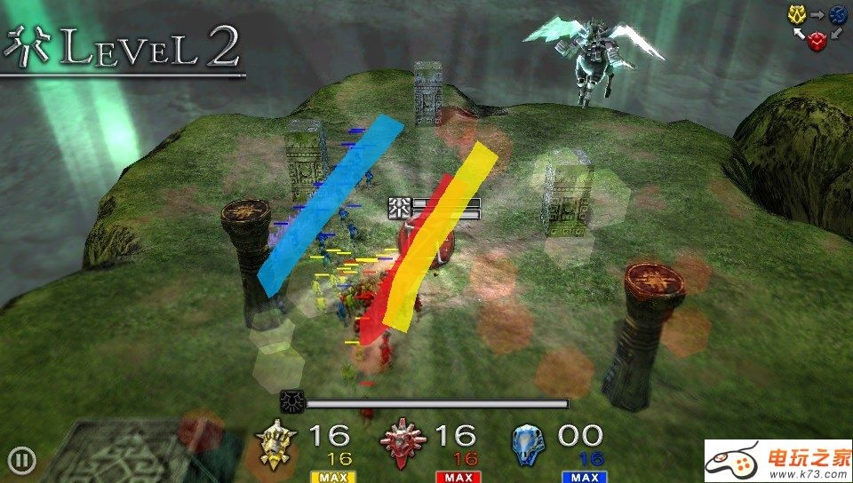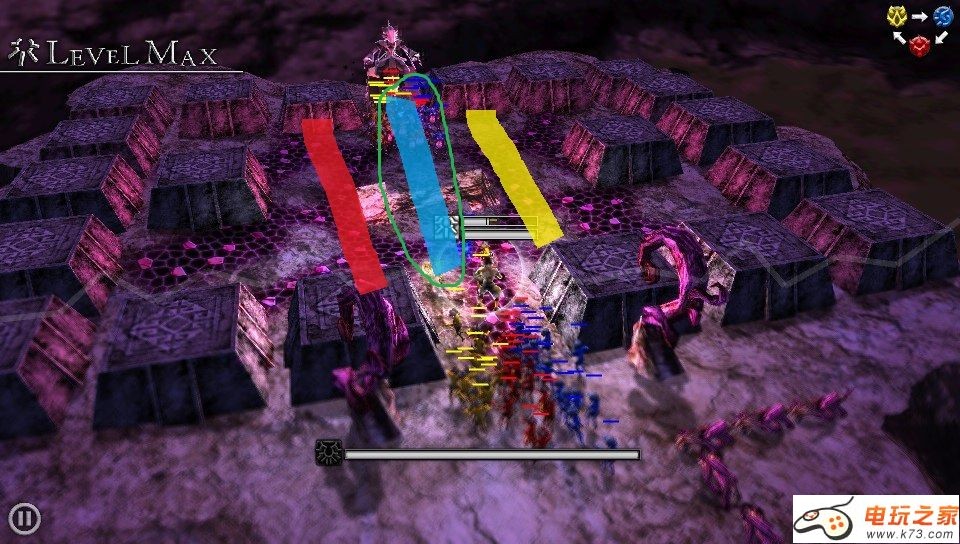 第十关 节奏比较慢,开场时候容易出错导致被围攻,注意开始时候的点击,不行就重新来,这关的支援棒比较难获得能量,要珍惜留在最后BOSS用,BOSS战 貌似是一个美女BOSS,BGM也有女声···这个BOSS刚打可能很混乱,布置怎么下手,其实只要按照下图的方式竖着布置弓手,属性分布要看BOSS当时面前的敌方属性来布置相克的小兵,加攻击状态最好加给中间的(由于战况可能又变,下面只是布置位置,具体要实际操作)。