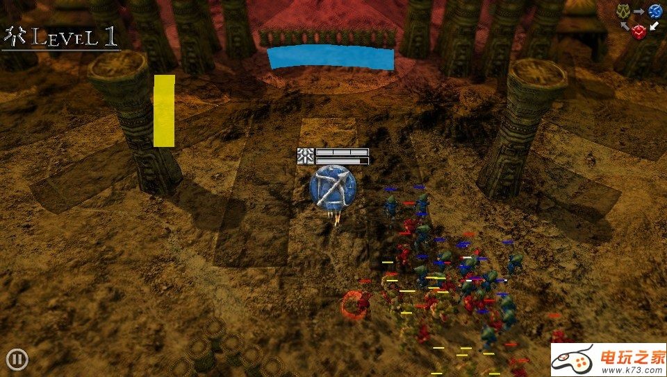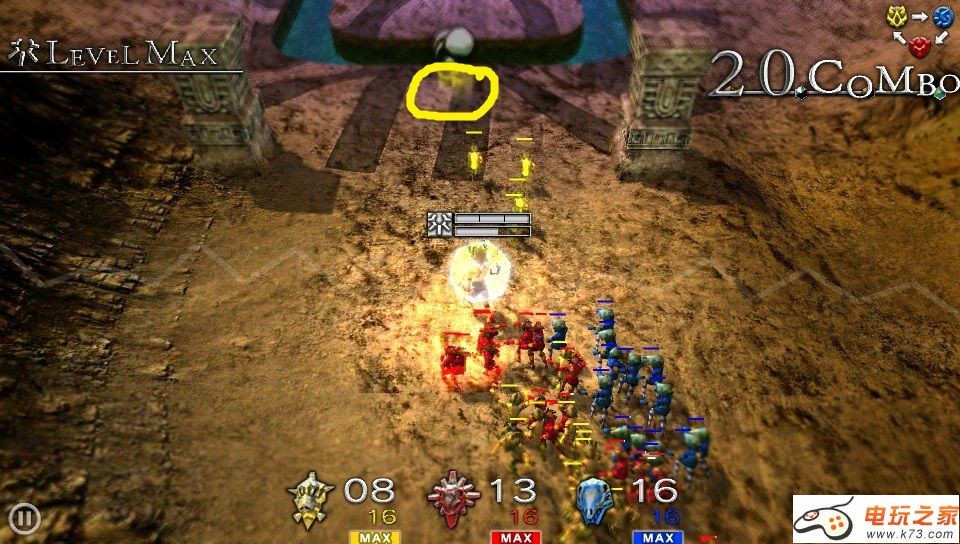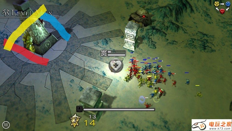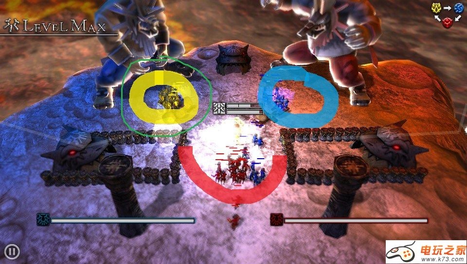 第二关 较慢节奏的BGM,注意点击时候的空隙时间,多试几次BOSS战,一个会移动的炮台,在下图位置的时候就优先把黄色全部布置成投石车在黄色圈内,接着把其他属性兵种的投石车都布置在同一个地方(加攻击状态)。