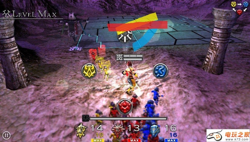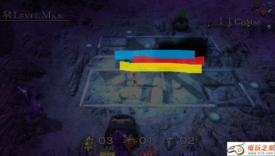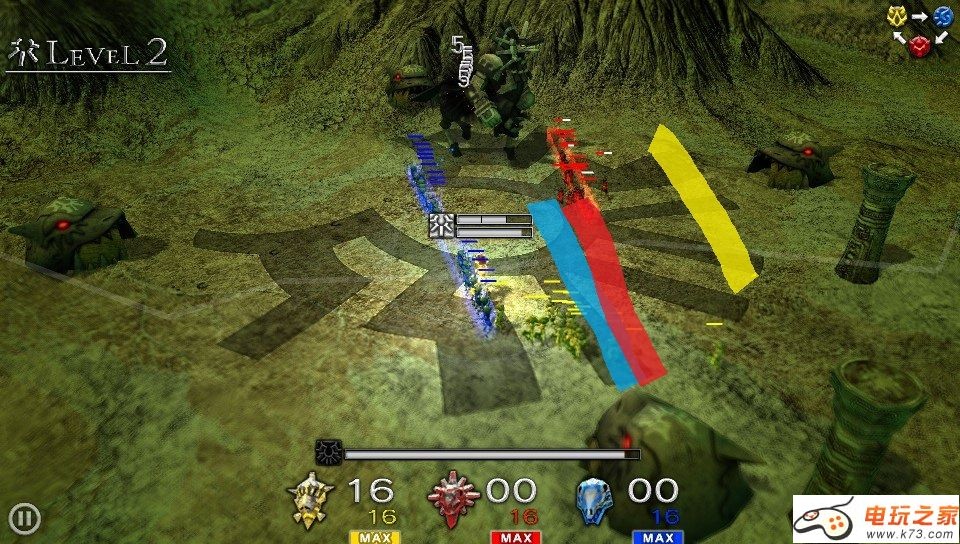 第十一关 毫无节奏的一关,大家都这么说``其实差不多了.过程的BGM比较难听到鼓点,要多次练习,提前布置小兵也是必须的,无法关闭的毒气记得提前布置投石车,不然到BOSS面前都没小兵能给你使唤了.BOSS战 很难的双子BOSS,不过打得好也是白搭的.我们在下图位置,就是刚到两个柱子时候,就把黄色投石车布置在左边BOSS面前,然后速度布置蓝色投石车在右边BOSS面前,剩下的红色用弓手在红线范围追击敌方小兵,适当在开场加好攻击,瞬间能把两个BOSS打到残血。