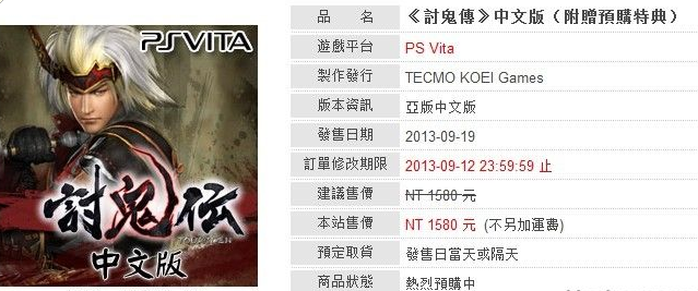 记得很多人在《讨鬼传》日文版刚发售的时候都说忍痛到中文版发售的时候再玩,我很佩服各位这么能忍耐,而现在大家苦等的《讨鬼传》亚洲中文版也终于迎来了它的发售日期,将于明于2013年9月19日正式发售,现在正在火热预购中,此消息来自台湾GAMER,此次中文版含有预购特