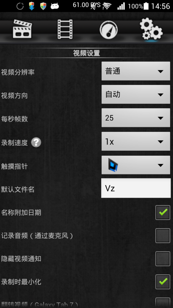 这里最主要看第四行,看看你的机子最多能录制多少帧的视频而不会发生声音画像不同的现象,然后跳到顶行最后一列【就是那个齿轮图标】看下图、这里设置详细的录像参数: