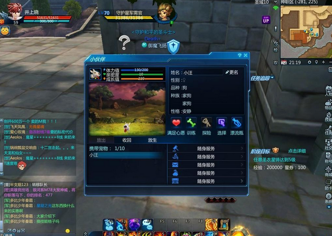 当宠物小伙伴放出来一段时间后,点击满足心愿可以提高宠物的亲密度。而点击训练会消耗宠物小伙伴的10 点体力,并增加宠物小伙伴的成长值10 点,每天最多训练三次,多训练只会消耗体力而不会增加。探险、选择及漂流瓶其实是满无语的功能,探险指和朋友组队,并且放宠物小伙伴组队去探险,然后会捡一些垃圾回来( 几乎是一些不值钱的材料和绿/ 蓝装备,打一次副本地上满满都是的那些… ) 。选择就是和抽卡片选择决定爱他/ 不爱他之类的东西…囧。最后的漂流瓶功能,就是丢一个留言看谁能够捡到,你可以在上面留下你的即时通号码,同时加上性别、年龄和交友对象,然后听天而命,看是那位玩家捡到…不过个人认为这个比系统的交友圈圈还不靠谱,圈圈还可以找等级和性别,带低等级的妹子练功说不定还有搞头,漂流瓶…就算了…。