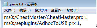 (注意,psp系统不一样的话,插件也不一样,选择的时候注意一下)如果你没有金手指插件,可以直接把附带的seplugins和CheatMaster文件夹复制进psp根目录,然后在seplugins里的game文本文件中添加一行:ms0:/seplugins/AdhocToUSB.prx 1。