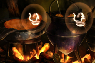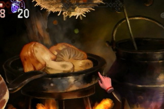 选择开始露营的话,就会在画面上陈列出8种类的食材和3种类的调味料,以及平底锅,普通炊锅等料理用具。玩家需要往用具中混入食材和调味料,并且在烤和煮之间选择一种料理方法进行烹饪,然后食用。锅的种类和料理的结果没有直接关系,可以依据自己的喜好进行选择。