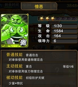 憎恶 主动技能:重击 生命:69593|攻击:2061 |