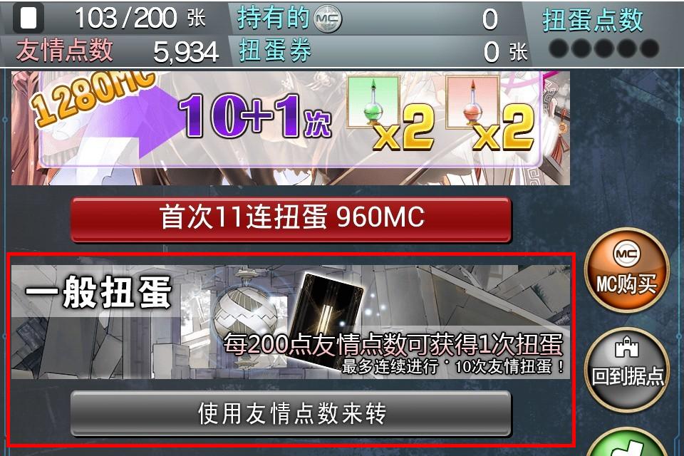 点击扭蛋按钮滚动屏幕至最下方,即可看到友情点数扭蛋按钮。