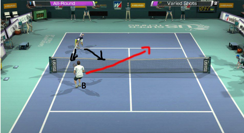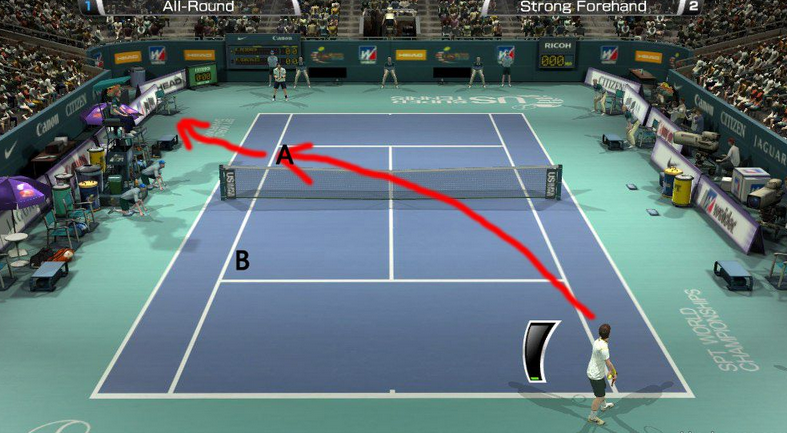 外旋发球:外旋发球是网战中很常见的发球,对npc这种发球的得分率是非常高的,以下我拿费德勒来当例子:费德勒是右撇子(大部分球员),站在右半场发球时就能够发出外旋球,操作方法是确认蓄力在50%以下时把落点控制在A点附近(摇杆←+↓),发球的力度越小,球旋转的角度就越大。站位越靠右,可调动的距离越大。这种球对npc有90%的得分几率,也是人机刷ace球的唯一手段,就算npc把球打回来,一般都会在B点附近,接下来你要做的就是一记右侧抽球得分了。