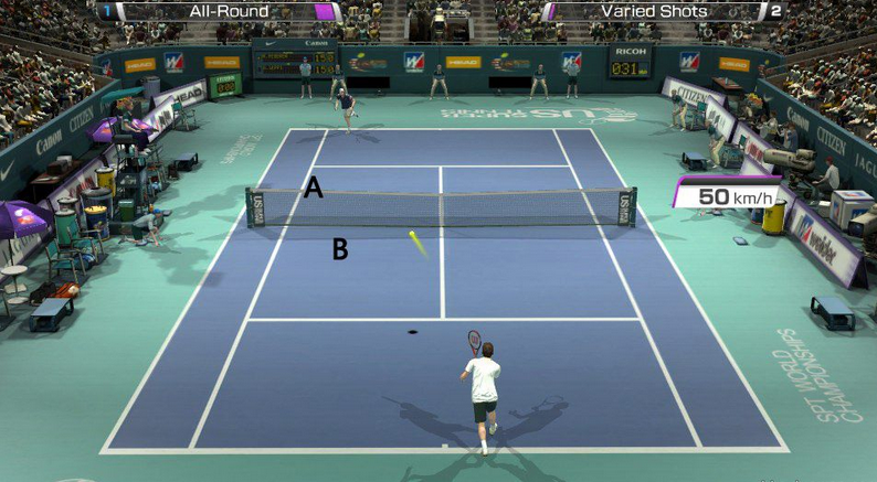 下手球趣味研究:下手球是个玩弄对手的神技,因为他可以在发球时就能强制使对方上网,所以这种发球在经过练习以后可以把对手弄得哭笑不得。举个例子,我们先用↓+□x,发球准备动作中配合←+↓打出一个落点在A点的下手球,然后马上上网,站在B点狂按X+→打出一记截击,这招真的很贱,无论是npc还是网战都非常管用,只是要稍加练习,把发球落点控制的越深越靠左就越贱。反方向发球的话一样很管用,大家可以多多试试。