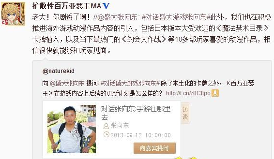 今天在微博上进行了盛大游戏CEO张向东的微访谈,就在刚刚,张向东爆了一条猛料!