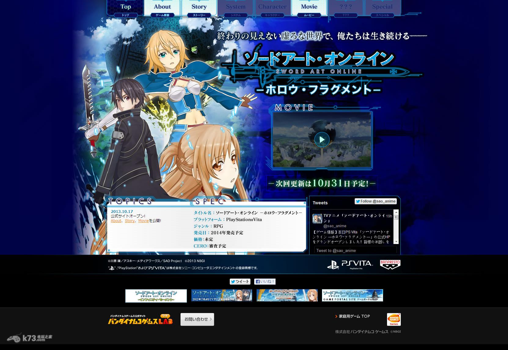 日本NBGI公司于今天正式公开了psv动作角色扮演游戏《刀剑神域 虚空的碎片》的游戏官方网站,官网上更新了游戏的概要、故事背景、宣传视频等内容,以下是官网地址。
