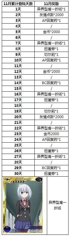 11月1日-11月15日期间,每次11连扭蛋将必定获得随机一张SR超限定版《约会大作战》珍藏卡小小狂三、小小十香、小小琴里、小小折纸、小小四糸乃!