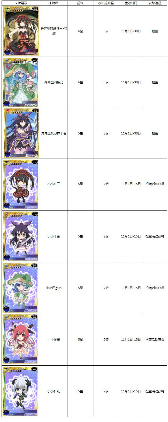 2.本期《约会大作战》更新扭蛋卡牌均为限定卡牌,11月15日后将从扭蛋机中移除。