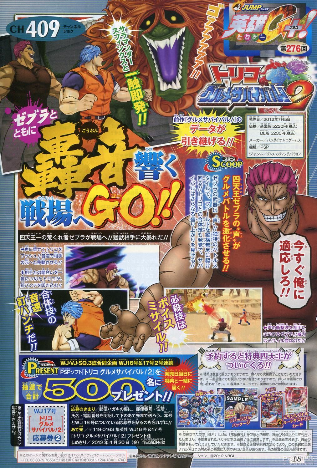 NBGI将会在PSP平台上推出《美食的俘虏:美食生存2》,并预定在7月5日发售。通常版和下载版的价格同为5230日元(含税)。