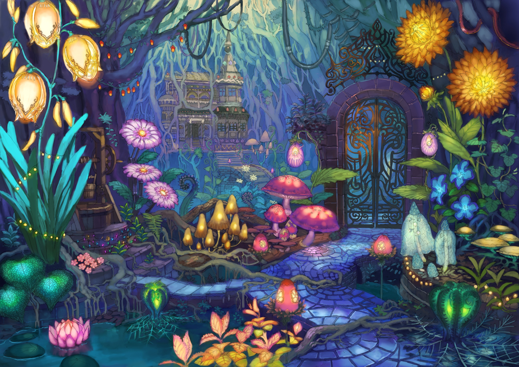 盛开着荧光色丰富的花朵的洞穴,洞穴本身看起来就像一根巨大的植物,洞穴被像灯泡一样的花所照亮了。