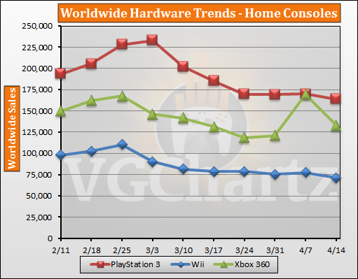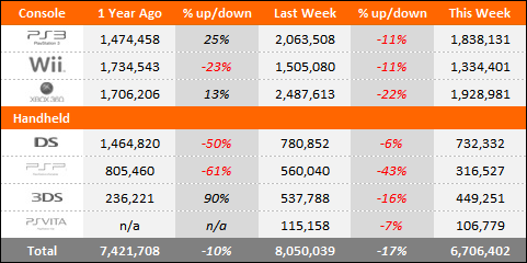 与上一年相比,PlayStation 3,Xbox 360和3DS游戏数量销量有所上涨,而Wii,PSP和DS则有所下降。PlayStation 3上涨了36万3673份(25%),Wii下降了40万0142份(-23%),而Xbox 360则上涨了22万2775份(13%)。DS下降了73万2488份(-50%),PSP下降了48万8933份(-61%),3DS则上涨了21万3030份(90%)。与去年同期相比,本周的游戏销量下降了71万5306份(-10%)。